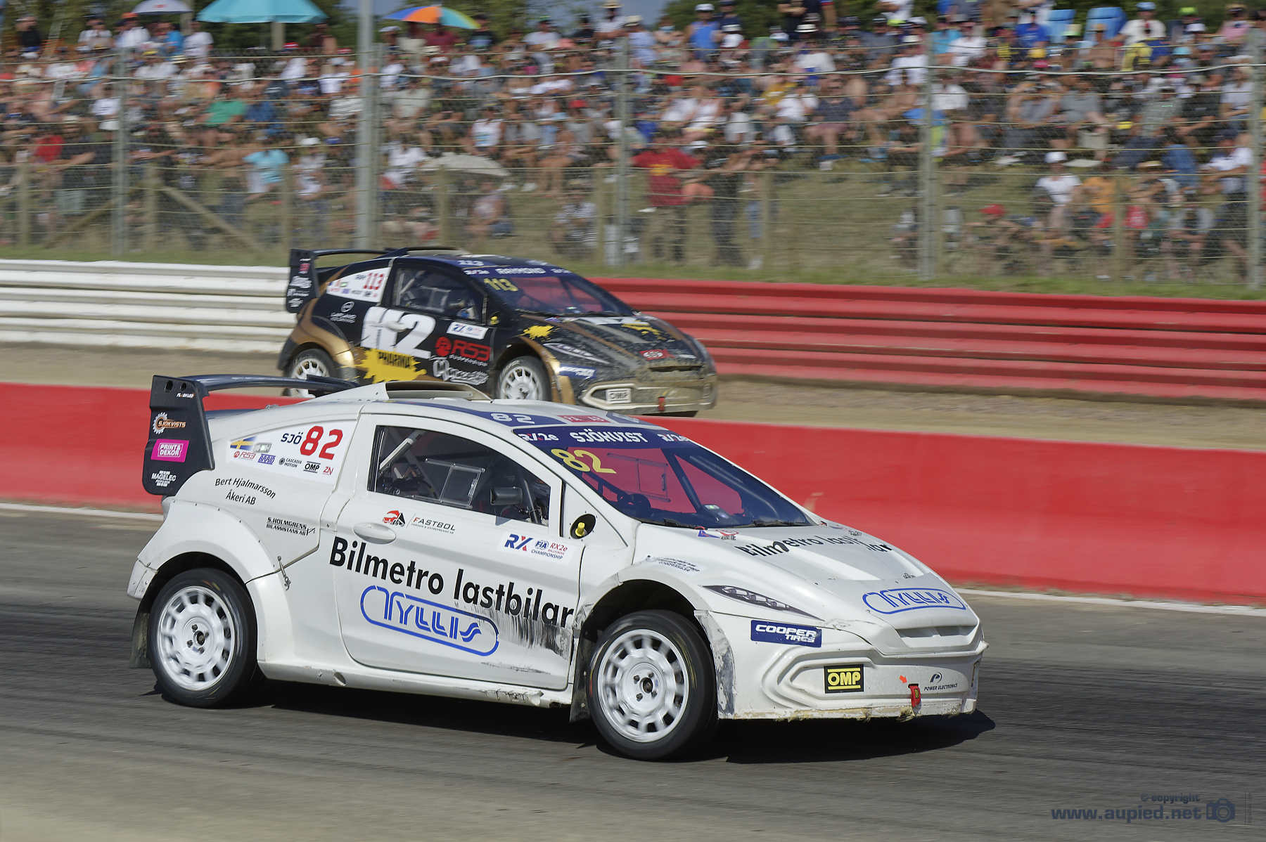 le pilote : Isak SJÖKVIST (SWE) RX2e (électrique)N°82 à la sortie du tour joker et le pilote : Cyril RAYMOND (FRA) RX2e (électrique)N°113 en arrière plan - Rallycross de Lohéac le 4 et 5 Septembre 2021