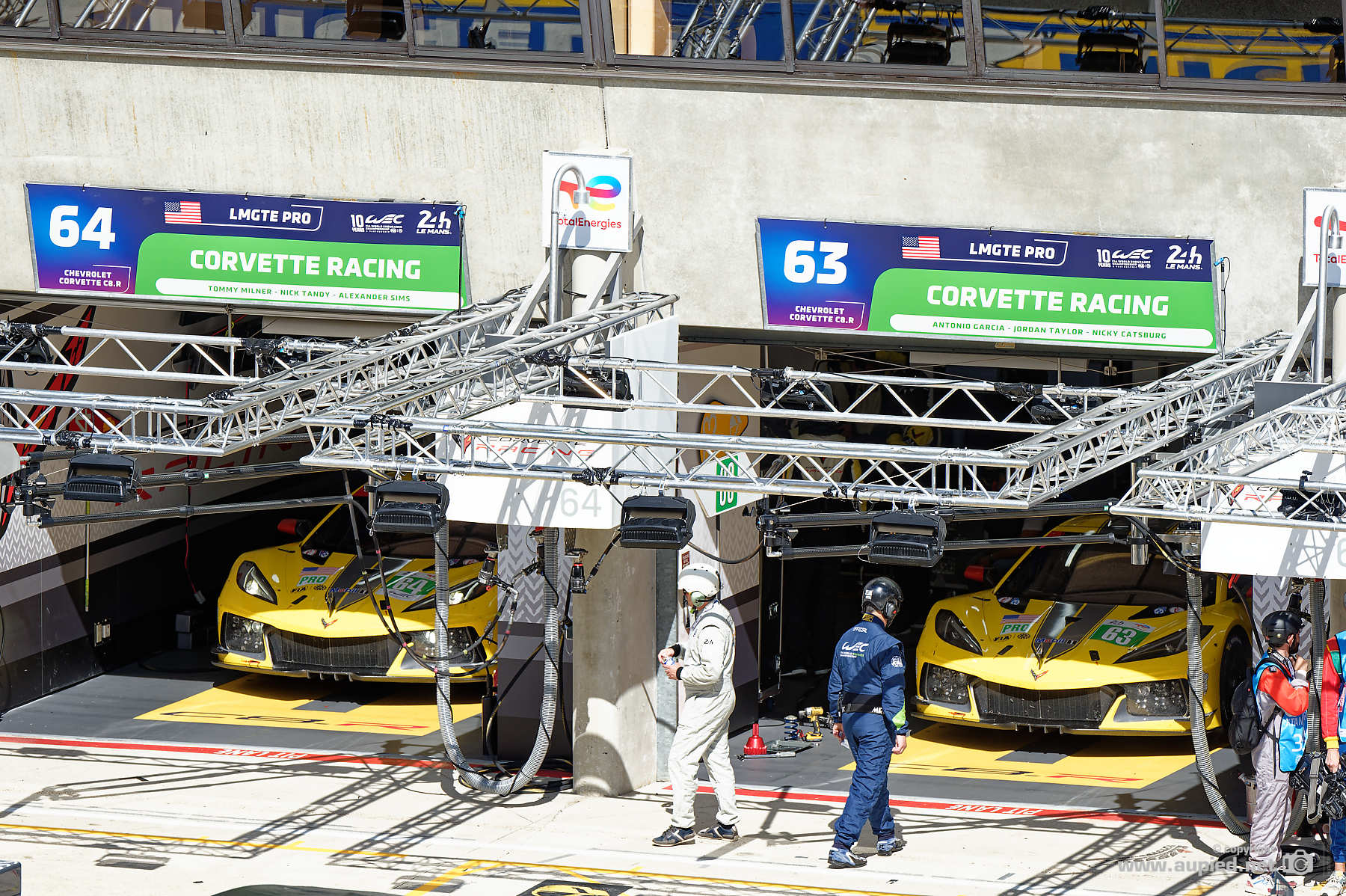 24 Heures du Mans 2022 - Voiture N° 63 Chevrolet Corvette C8.R - Ecurie : CORVETTE RACING - Catégorie LM GTE Pro - nationalité : USA - Pilote 1 : Antonio Garcia (ESP) Pilote 2 : Jordan Taylor (USA) Pilote 3 : Nicky Catsburg (NLD) et la Voiture N° 64 Chevrolet Corvette C8.R - Ecurie : CORVETTE RACING - Catégorie LM GTE Pro - nationalité : USA - Pilote 1 : Tommy Milner (USA) Pilote 2 : Nick Tandy (GBR) Pilote 3 : Alexander Sims (GBR) Image réalisée le 8 Juin 2022 lors des essais des 24 Heures du Mans