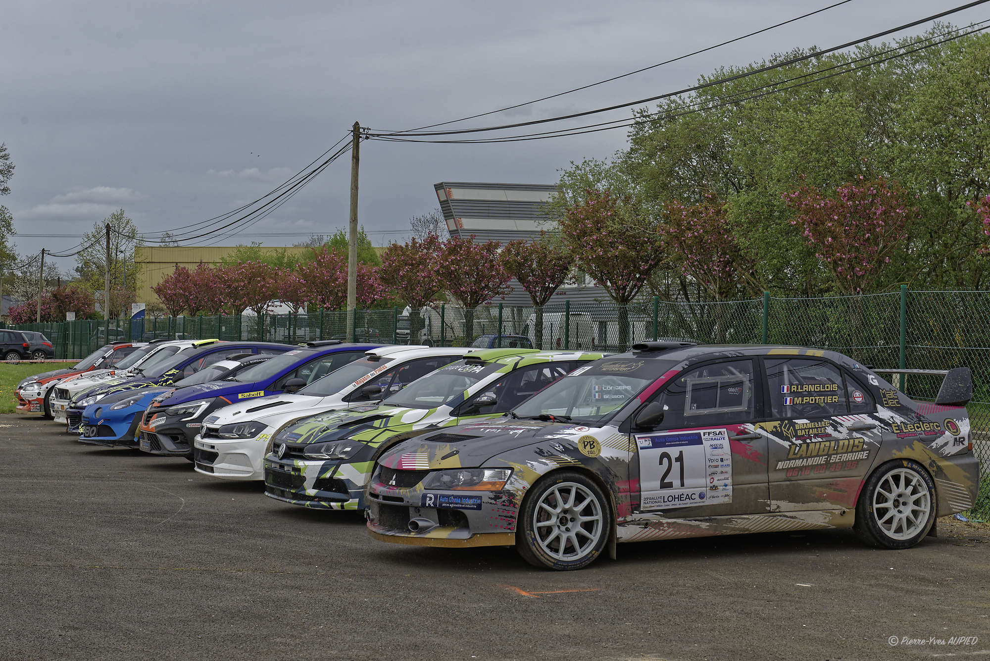 Rallye du Pays de Lohéac 2024 : Parc fermé. Au premier plan la voiture d'Anthony LANGLOIS - copilote : Margot POTTIER - N° 21 MITSUBISHI Lancer Evo 9 - groupe FRNat - classe R4