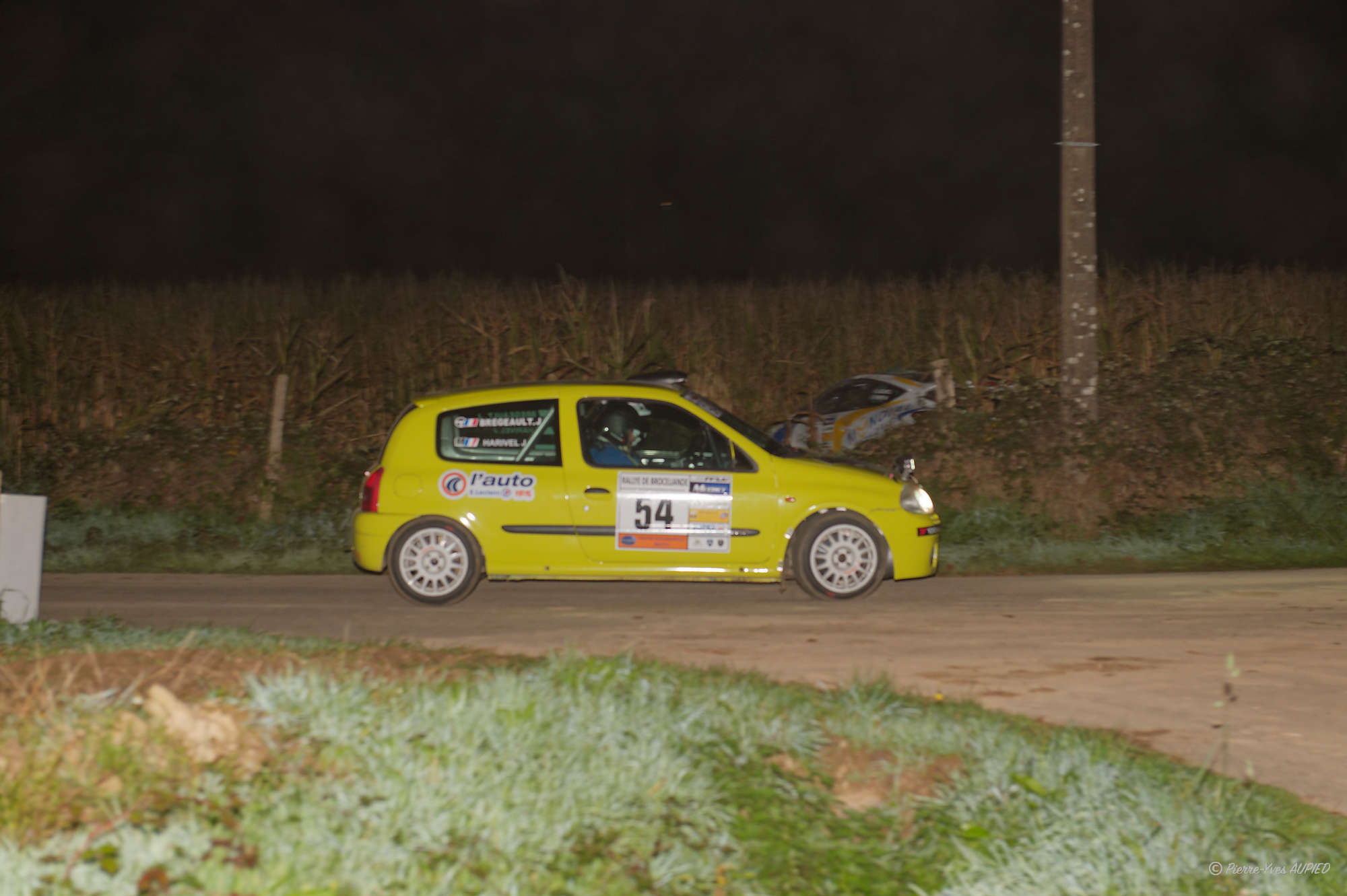 Le pilote BREGEAULT Julien et le copilote HARIVEL Jerome sur Renault Clio n°54 en groupe FRC4 - en classe A7 au rallye de Brocéliande 2024 pendant l'épreuve de nuit.