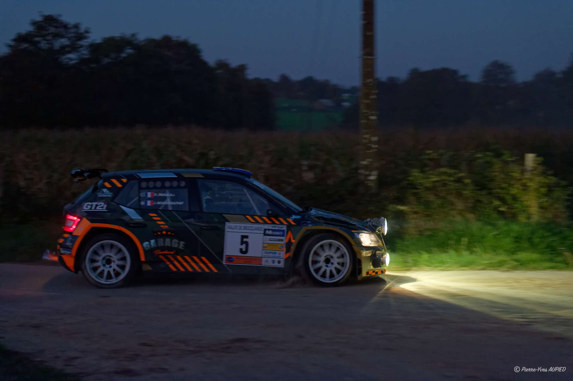 Le pilote BORDAGARAY Jeremy et le copilote RENAULT Pierre sur Skoda Fabia n°5 en groupe FRC2 - en classe Rally2 au rallye de Brocéliande 2024 pendant l'épreuve de nuit.